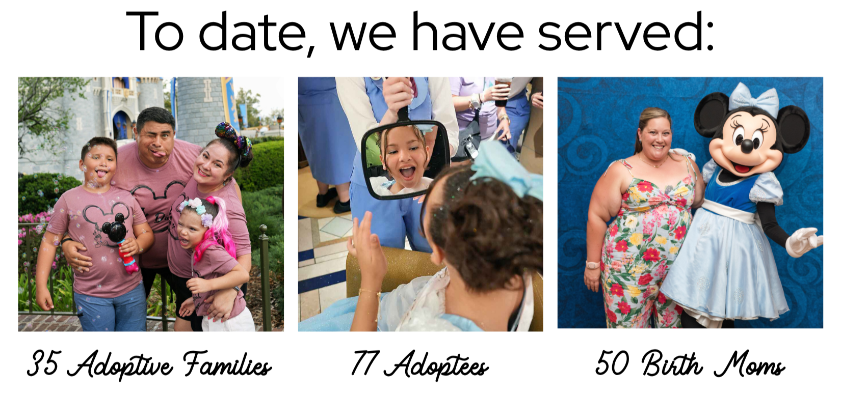 Our Magic Maker Program engages donors and volunteers who contribute resources and time to create these transformative experiences, ensuring that every family and birth mom enjoy the magic and joy of Disney in a meaningful way.